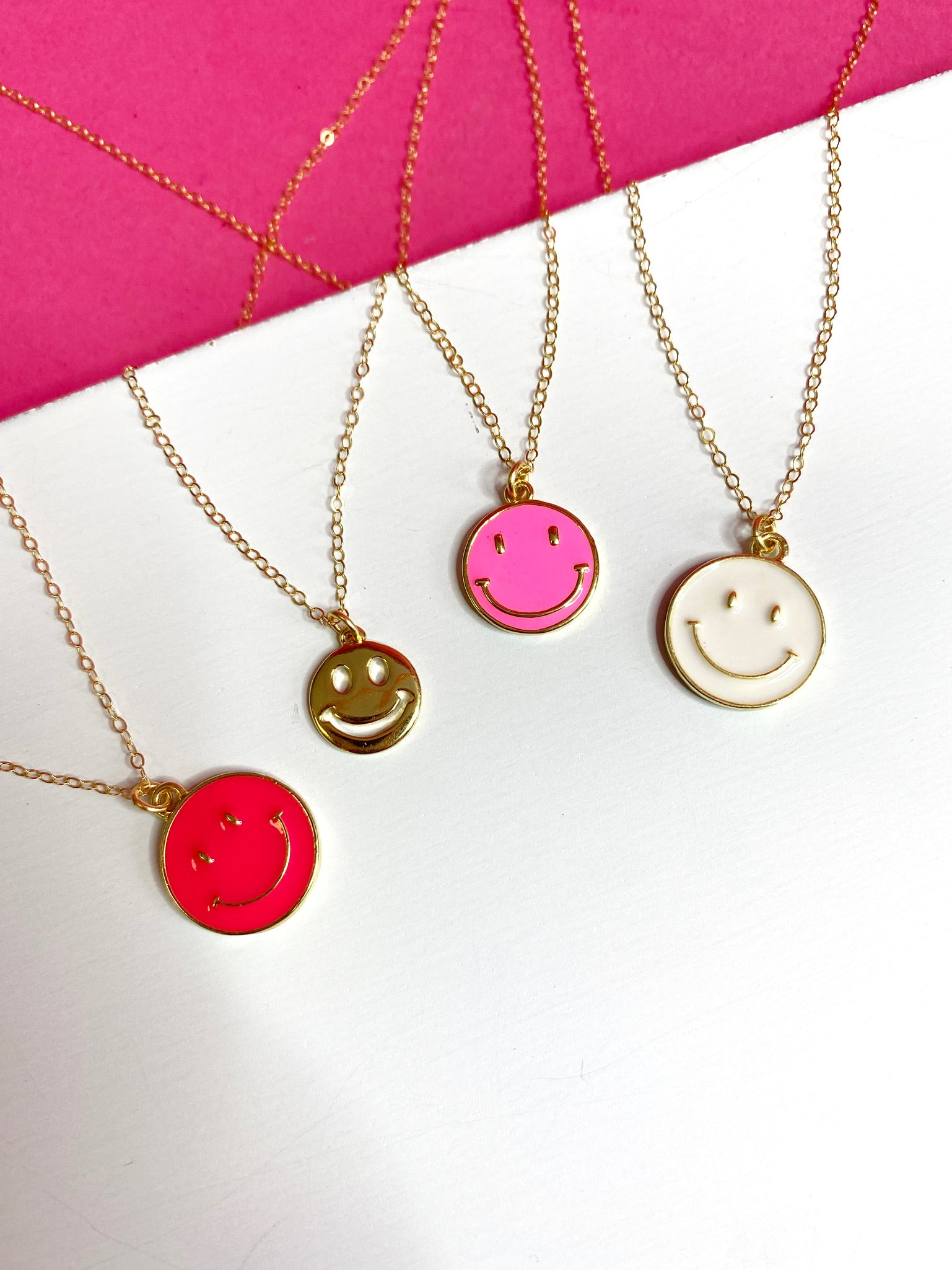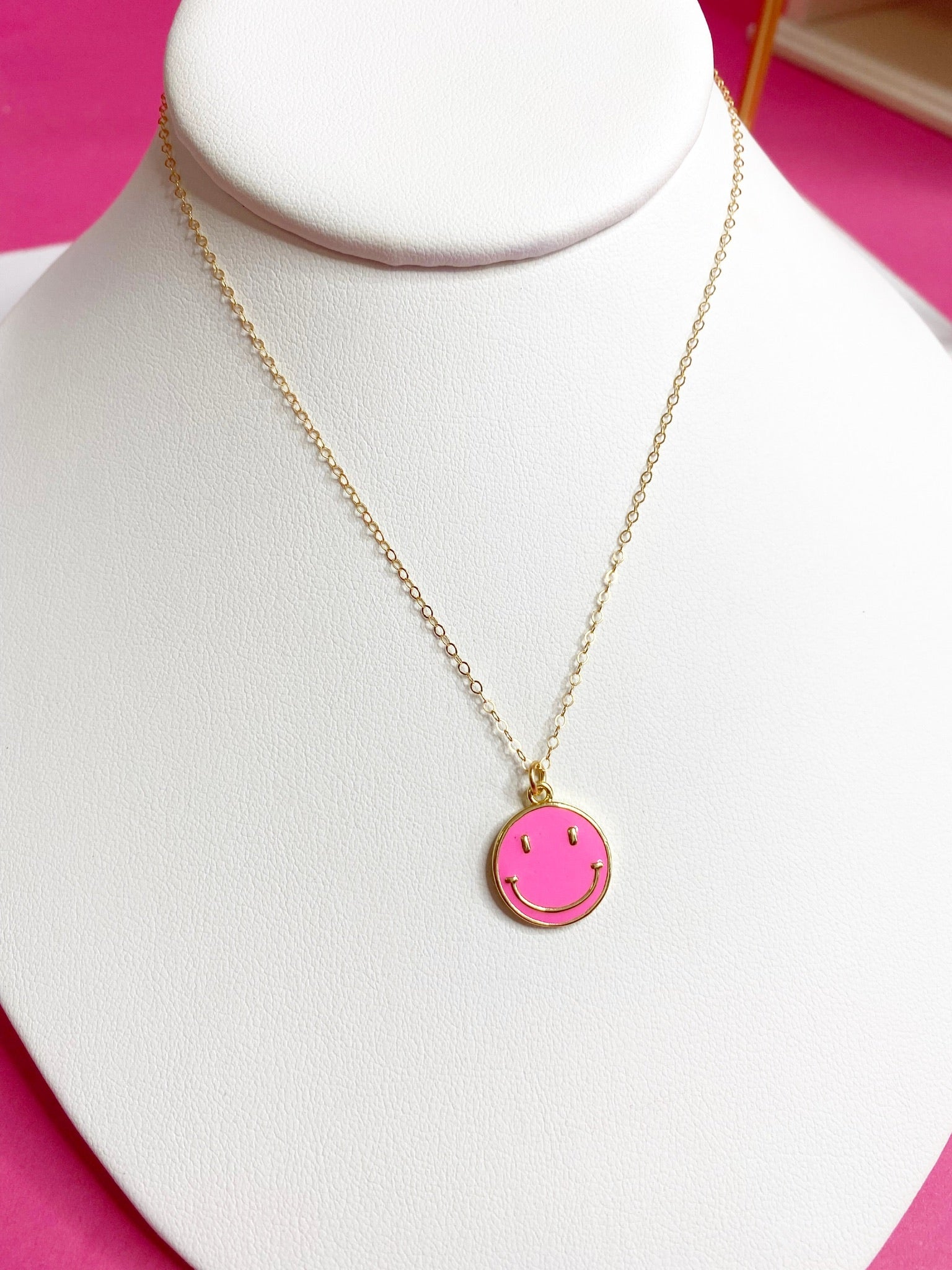 Featuring a charming smiley face pendant on a delicate gold-filled chain, this necklace comes in 4 fun colors to suit your style!